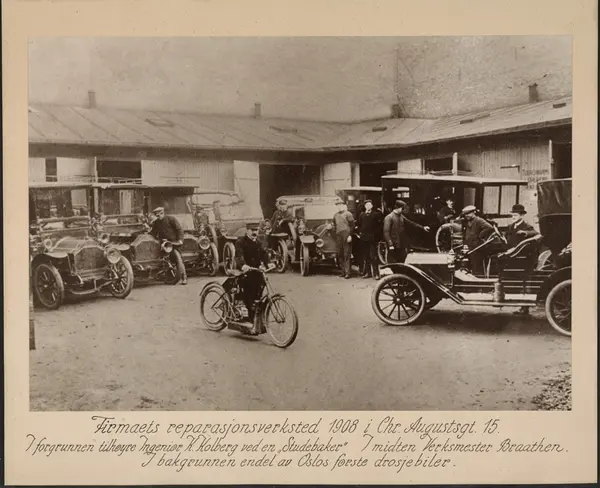 I midten verksmester Braathen. I bakgrunnen noen av byens første drosjer. Motorsykkelen er en dansk Elleham (1904 - 09) Konstruktør Jakob Ellehammer.