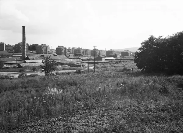 Bildet er tatt ved Økernveien, omtrent der T-banen nå går. I forgrunnen Hasle tegleverk og i bakgrunnen bebyggelsen ved St. Jørgens vei.
