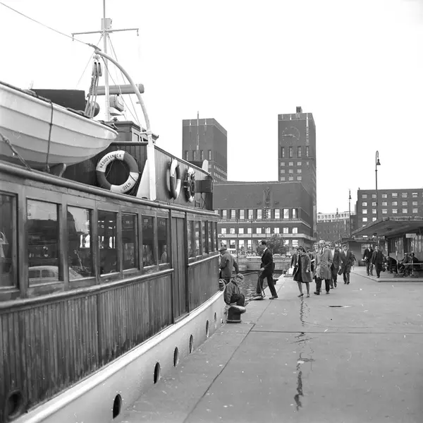 M/S Nesodtangen ved utstikker B. Her er det fem minutter igjen til avgangstiden kl. 15.50 og en rundtur til Nesoddtangen brygge og tilbake til Oslo kl. 16.35. Kl. 16.50 hadde denne båten (sommerrute 1962) sin siste avgang fra Oslo, og da ikke bare til Nesoddtangen, men til alle de 20 bryggene langs Nesoddens vestside. Turen ble unnagjort på to timer. Båten lå natten over på Digerud brygge, og startet opp igjen morgenen etter med "hovedruta", og var i Oslo igjen ca kl. 8.10.