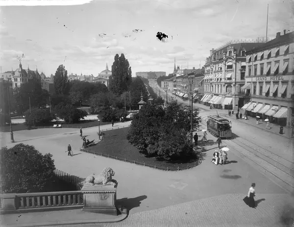utsikt, park, løveskulptur, mennesker, benker, kiosk, gateløp, Vålerengen-trikk, forretningsgårder, Grand Hotel, Hotell Nobel, Nationaltheatret, Slottet