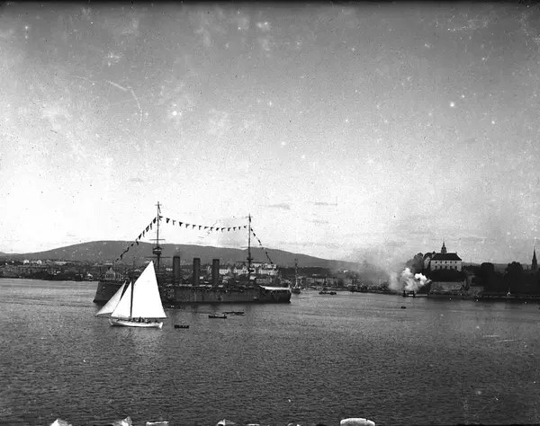 dampskip Kristianiafjord, seilfartøy, småbåter, britisk panserkrysser HMS Cornwall, Akershus festning, salutt, badehus