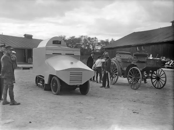 Til høyre Norges eldste automobil, en Benz Victoria fra 1895 som nå befinner seg på Norsk Teknisk Museum. Kjøretøyet til venstre er en Citroën beltebil (system Kégresse) chassis, sannsynligvis type P7T som har blitt påmontert et pansret karosseri. Adolphe Kégresse patenterte sitt system i 1913 og Citroën bygde troligvis 5.795 biler med dette systemet mellom 1921 og 1940. Bilene ble bygget i en mengde varianter for militært og sivilt bruk. Noen ytterst få eksemplarer er kjent i Norge, bla. brukt til transport av turister o.l. til fjells. Det syns som om dette er en demonstrasjon for norsk militært personell.