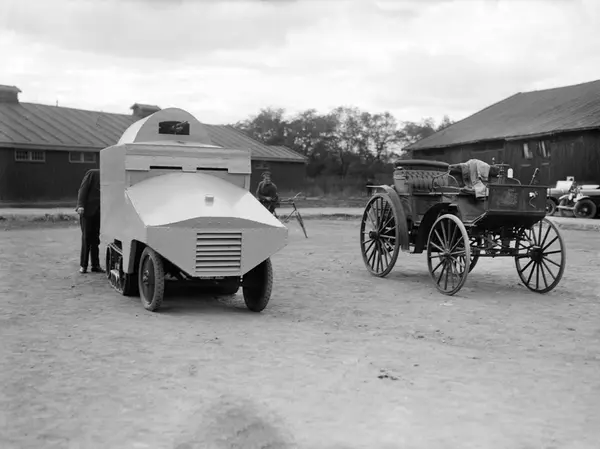 Til høyre Norges eldste automobil, en Benz Victoria fra 1895 som nå befinner seg på Norsk Teknisk Museum. Kjøretøyet til venstre er en Citroën beltebil (system Kégresse) chassis, sannsynligvis type P7T som har blitt påmontert et pansret karosseri. Adolphe Kégresse patenterte sitt system i 1913 og Citroën bygde troligvis 5.795 biler med dette systemet mellom 1921 og 1940. Bilene ble bygget i en mengde varianter for militært og sivilt bruk. Noen ytterst få eksemplarer er kjent i Norge, bla. brukt til transport av turister o.l. til fjells.