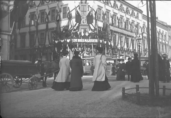 fortau, mennesker, trikk, hestekjøretøy, gateliv, Grand Hotel, girlander, kong Edwards og dronning Alexandras besøk