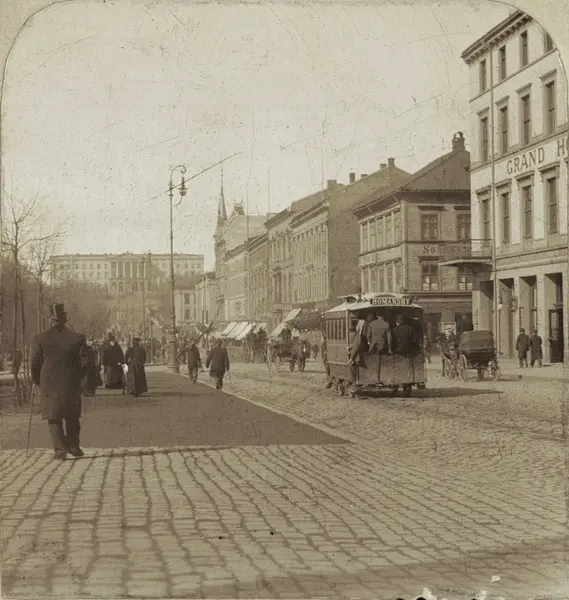 gateløp, mennesker, hestesporvogn, hestekjøretøyer, Grand Hotel, bygårder