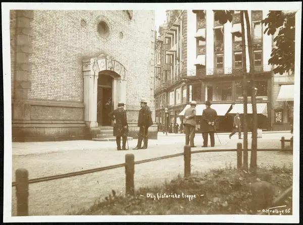 Stortingsbygningen, inngang på baksiden, dør, trapp, menn, forretningsgård