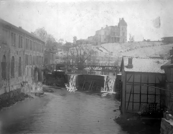 Bentse bruk, fabrikkbygninger, elv, demning, villa