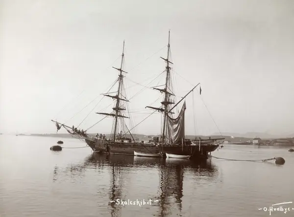 Bildet viser skoleskipet "Statsraad Erichsen" som ble Kristianias nye seilende skoleskip fra 1902, - innkjøpt fra marinen året før. Oscar Hvalbye (1864-1938) tok teologisk embetseksamen 25 år gammel. Han arbeidet for bymisjonen (Kristiania Indremisjon) og var prest i Sagene menighet. Som ivrig amatørfotograf samarbeidet han med sin gode venn Anders B. Wilse. Han var virksom i Oslo i perioden ca 1890-1920. Hans fotosamling ble i 1986 gitt til Oslo Bymuseum.