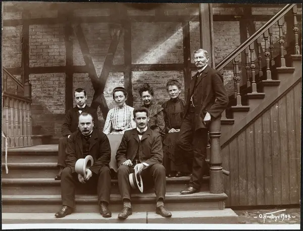 Kristiania Indremisjon, Centrallokalet, misjonshus, gårdsinteriør, bindingsverkvegg, trapp, menn, kvinner