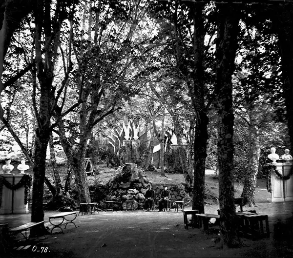 løvskog, benker, mennesker, bryllupsfest, portrettbyster, flagg