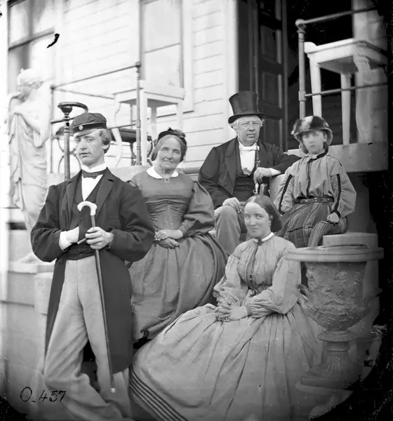 Bildet viser kasserer ved Rikshospitalet Adolph Theodor Grimsgaard og hans kone Caroline Emilie Widerberg sammen med datteren Marie Margrethe Grimsgaard og deres pleiebarn Christine Sophie Berg, som var søsterdatterdatter av konas søster. Mannen i forgrunnen er ifølge beskrivelsen Richard Olsen.