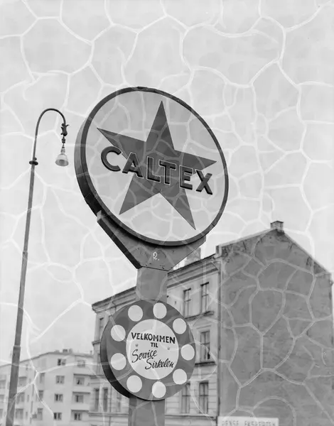 Caltex bensinstasjon, skilt, bygårder