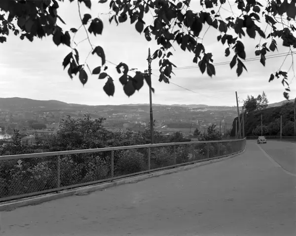 Kongsveien rett nord for Sjømannsskolen/Kongshavn vidregående. Ekebergbanen langs skrensen til høyre. Fotografen står ved veien som går inn mot skolen.
