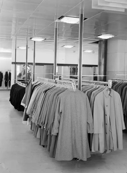 Ferner Jacobsen herrekonfeksjonsforretning, interiør, utstilling, stativer, frakker