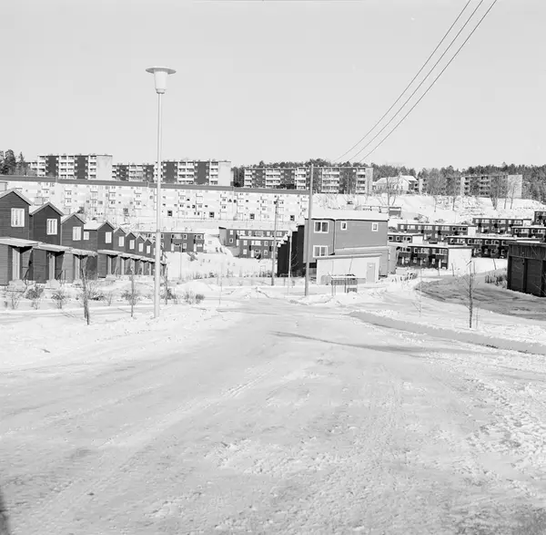Rekkehusene i forgrunnen tilhører Skullerud. I bakgrunnen sees Rustad Borettslag (Rustadgrenda). Vi ser også våningshuset og stabburet til Rustad gård til høyre i bildet.