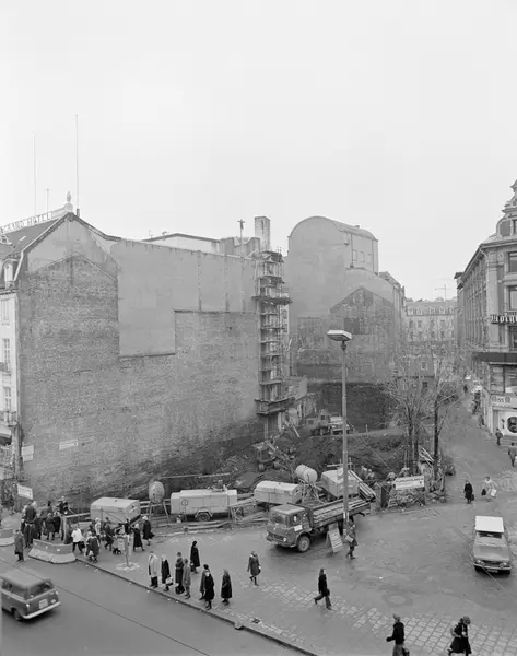 byggetomt, Grand Hotels tilbygg, mennesker, lastebiler, anleggsmaskiner, Grand Hotel, Oslo Nye Teater