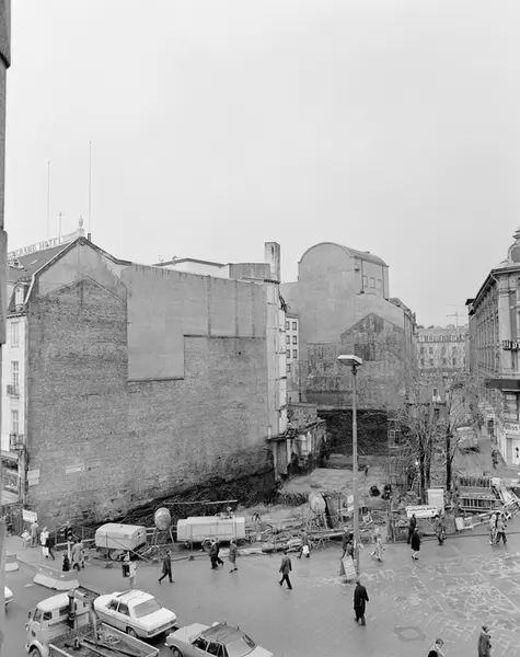 byggetomt, Grand Hotels tilbygg, mennesker, lastebiler, anleggsmaskiner, Grand Hotel, Oslo Nye Teater