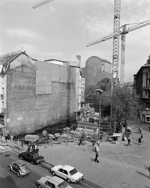 byggetomt, Grand Hotels tilbygg, mennesker, lastebiler, anleggsmaskiner, kran, Grand Hotel, Oslo Nye Teater
