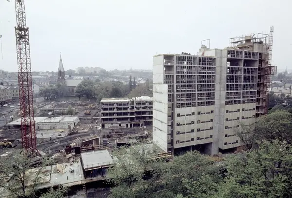 byggetomt, Yrkesskolenes hybelhus, kran, gateløp, bygårder, Jakob kirke