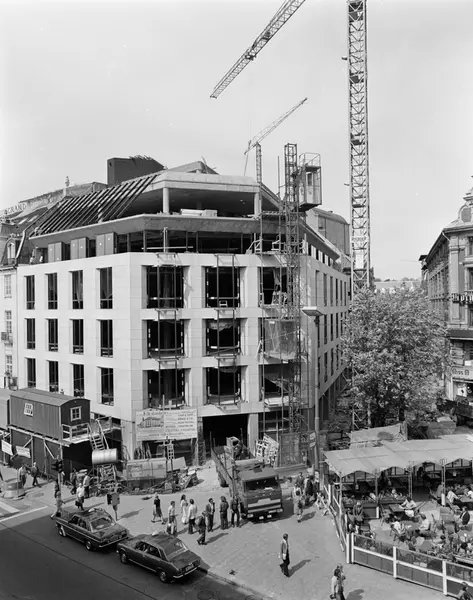 byggetomt, Grand Hotels tilbygg, kran, nybygg, biler, mennesker, brakker, friluftsrestaurant, gateløp, forretningsgårder