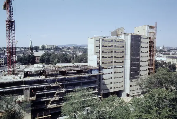 byggetomt, Yrkesskolenes hybelhus, kran, gateløp, bygårder, Jakob kirke