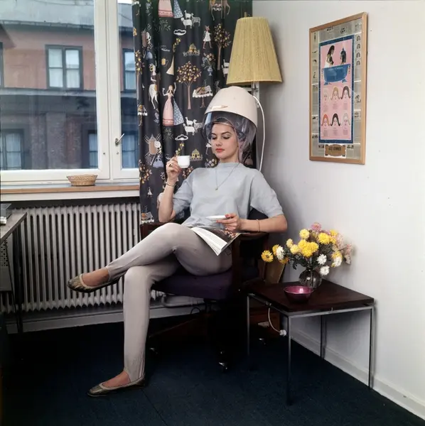 kontor, interiør, kvinne, hårtørrer, Alle kvinners blad, kaffekopp