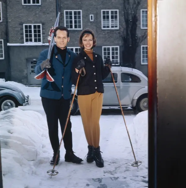 dobbeltportrett, kvinne, mann, modeller, skiklær, ski, biler, Volkswagen (Folkevogn), bygård, snø