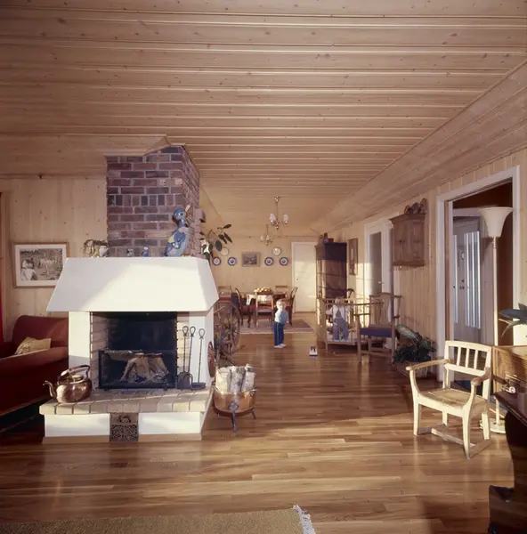 villa, interiør, stue, peis, furupanel, lekegrind, barn