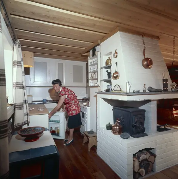 bolighus, trehus, interiør, kjøkken, peis, kvinne, kjøleskap