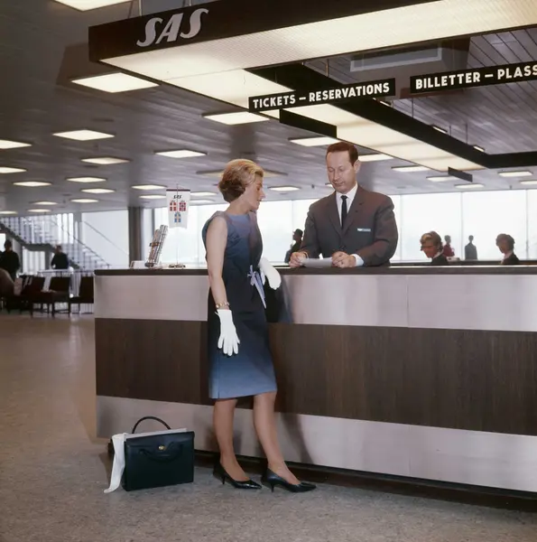 Oslo lufthavn Fornebu, interør, SAS billettskranke, mann, ekspeditør, kvinne