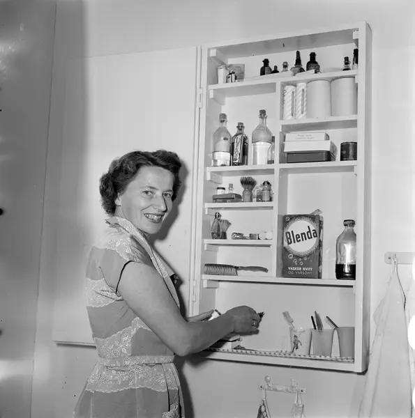 bolighus, interiør, baderom, kvinne, skap, toalettsaker, vaskemidler