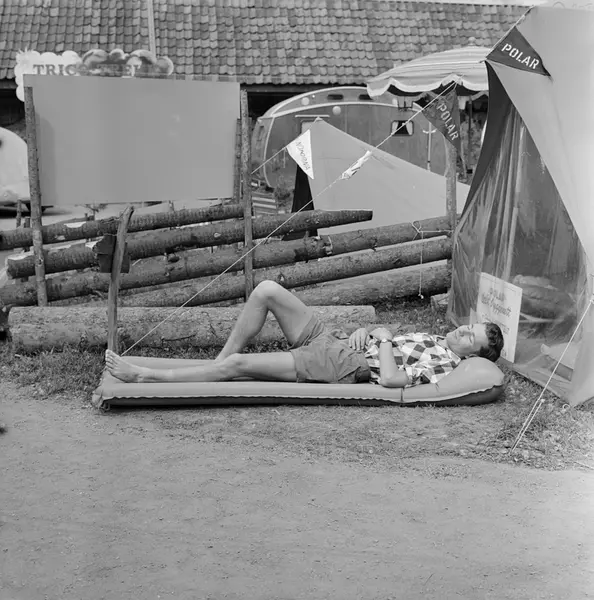 Frogner Hovedgård, Oslo Bymuseum, campingutstilling, telt, mann, luftmadrass, campingvogn