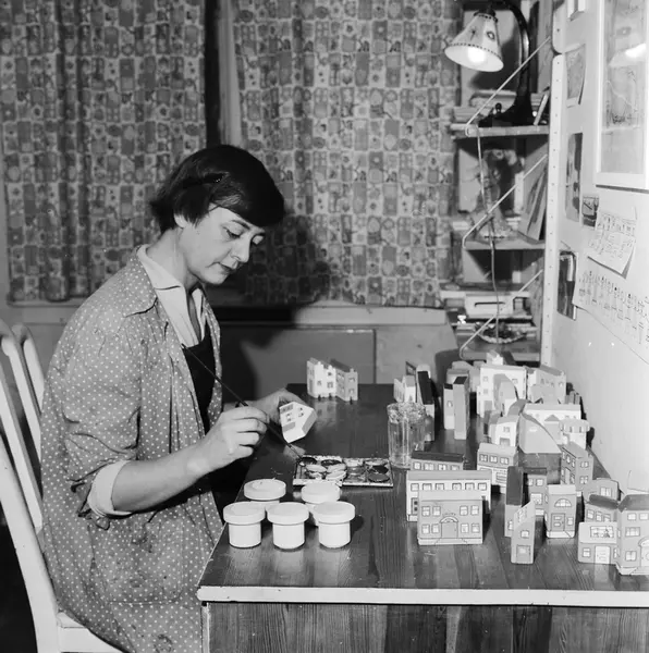 bolig, interiør, kvinne, skuespiller, brukskunstner, arbeidsbord, maling av modellhus