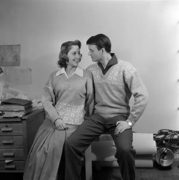 Mette Lange-Nielsen og Per Lillo-Stenberg viser strikkegensere.