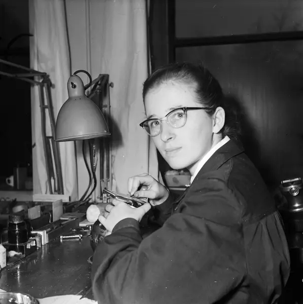 Fotografert for Alle Kvinners serie "Yrker". Rigmor Dahl Delphin (1908-1993) var ansatt som fotograf i ukebladet Alle Kvinner. Hennes negativarkiv ble i 2005 overført Oslo Bymuseum fra Gyldendal Norsk Forlag som var utgiver av bladet.
