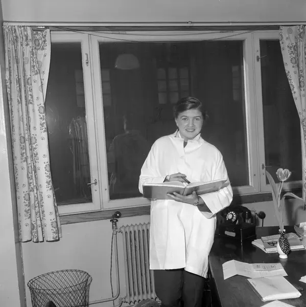 Fotografert for Alle Kvinners serie "Yrker". Rigmor Dahl Delphin (1908-1993) var ansatt som fotograf i ukebladet Alle Kvinner. Hennes negativarkiv ble i 2005 overført Oslo Bymuseum fra Gyldendal Norsk Forlag som var utgiver av bladet.