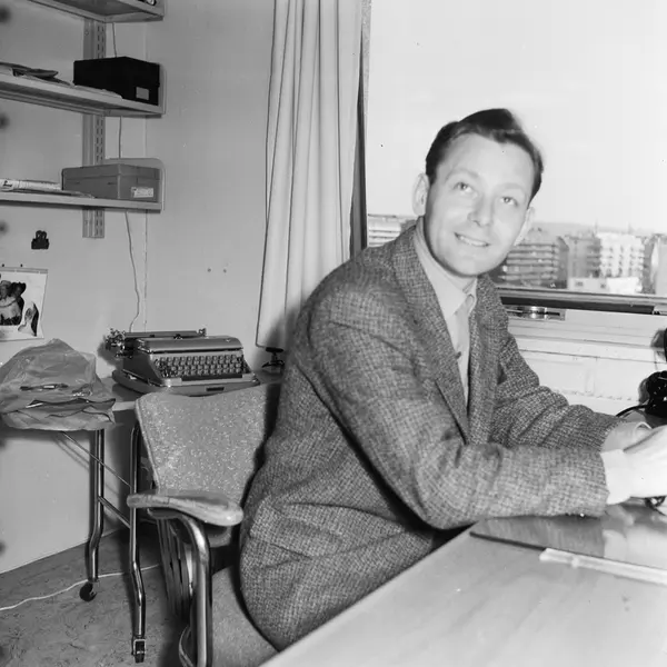 Norsk Rikskringkasting, interiør, kontor, mann, programsekretær, sittende halvfigur ved skrivebord