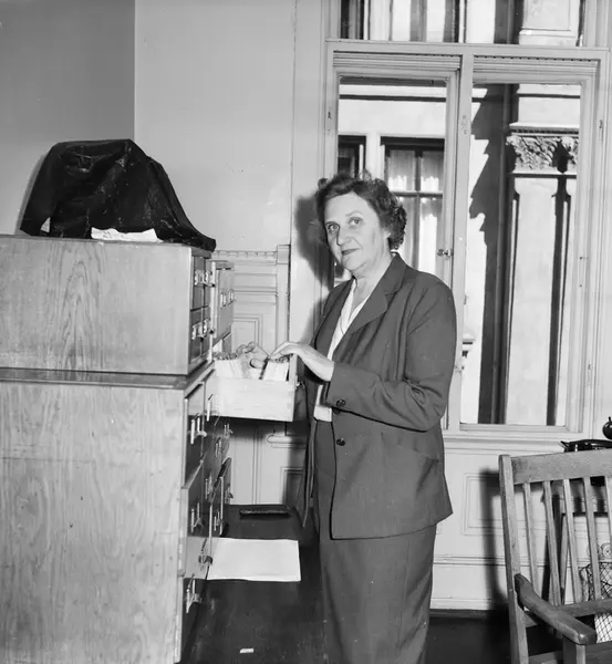 Fotografert for Alle Kvinners serie "Yrker". Rigmor Dahl Delphin (1908-1993) var ansatt som fotograf i ukebladet Alle Kvinner. Hennes negativarkiv ble i 2005 overført Oslo Bymuseum fra Gyldendal Norsk Forlag som var utgiver av bladet.
