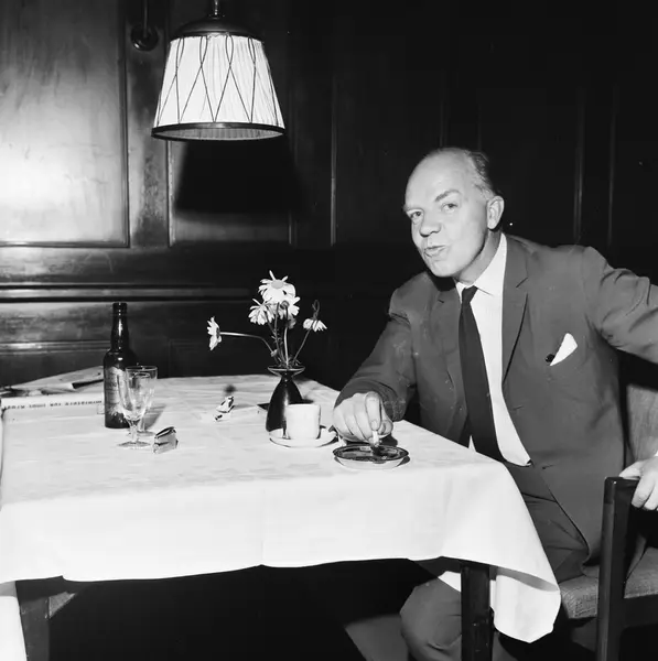portrett, mann, skuespiller, sittende halvfigur ved restaurantbord, sigarett