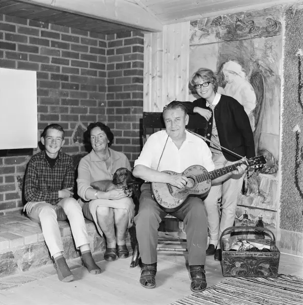 bolig, interiør, stue, familiegruppe, mann, forfatter, visesanger, gitar, kvinne, jente, gutt, hund