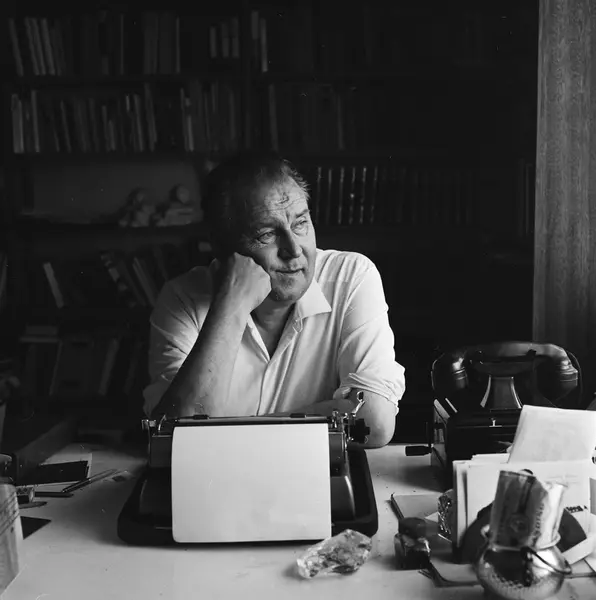 bolig, interiør, mann, forfatter, visesanger, sittende halvfigur ved skrivebord, skrivemaskin, bokhylle