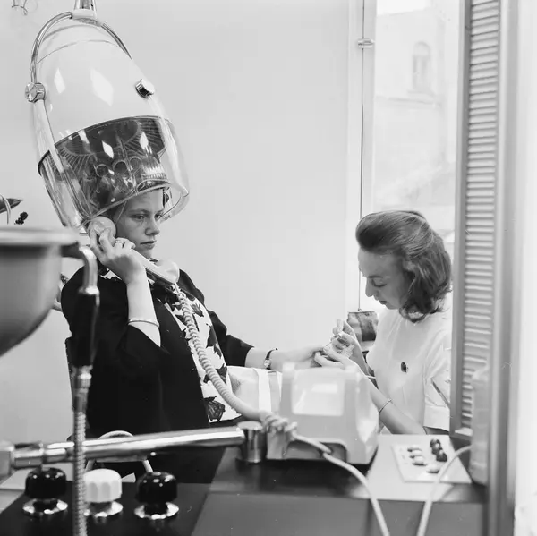 frisørsalong, interiør, kvinner, hårtørrer, telefon, manikyr