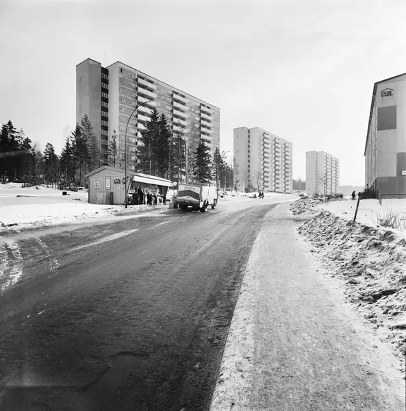vei, blokkbebyggelse, kiosk, "Gulebua", biler, mennesker