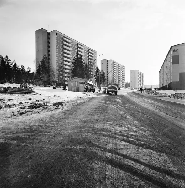 vei, blokkbebyggelse, kiosk, "Gulebua", biler, mennesker