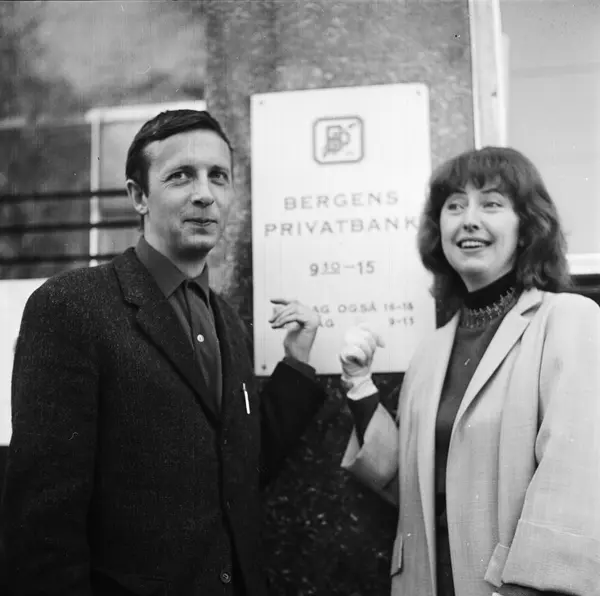 dobbeltportrett, ektepar, mann, forfatter, kvinne, bibliotekar, skilt: Bergens Privatbank