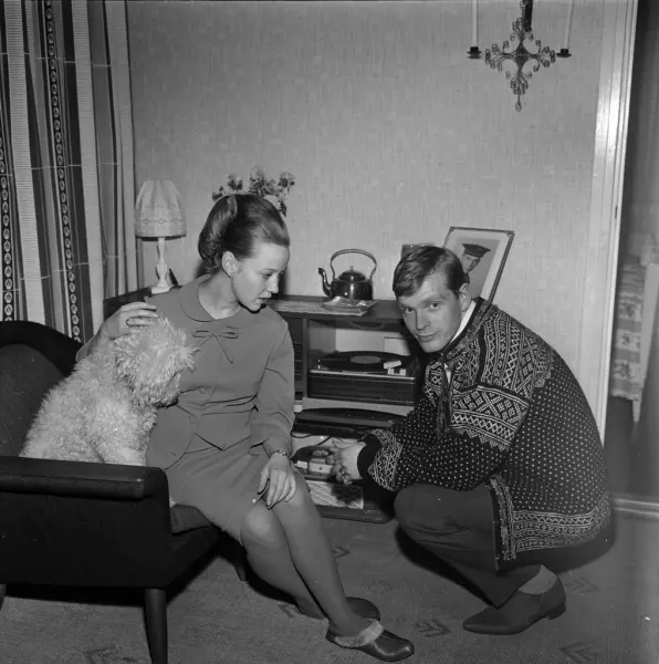 bolig, interiør, stue, kvinne, sangerinne, sittende i sofa, mann, hund, puddel, platespiller