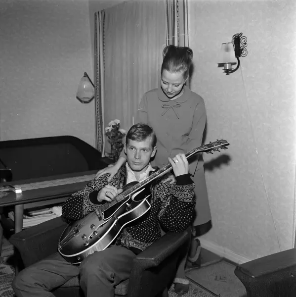 bolig, interiør, stue, kvinne, sangerinne, mann, gitarist