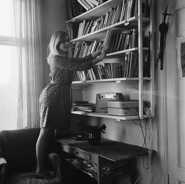 bolig, interiør, kvinne, skuespiller, stående helfigur i stol ved bokhylle