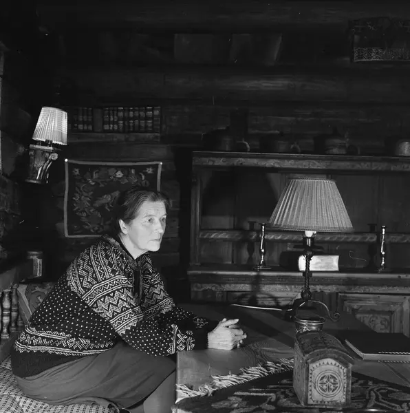 Bjørnsgard, tømmerhus, interiør, stue, kvinne, skuespiller, bondeantikviteter