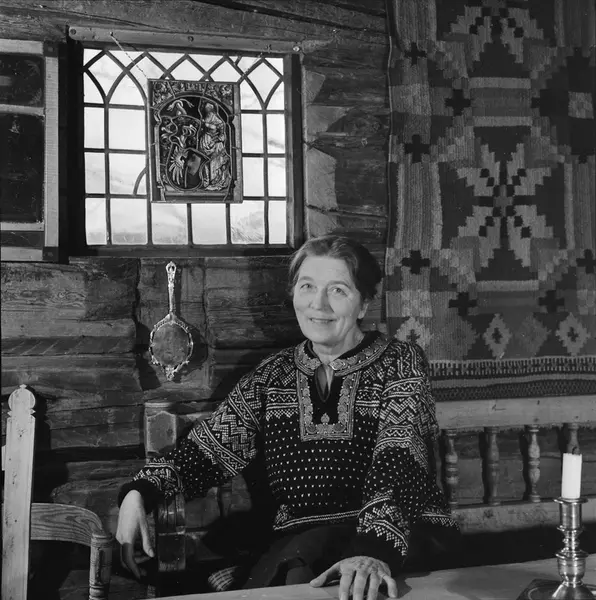 Bjørnsgard, tømmerhus, interiør, stue, kvinne, skuespiller, bondeantikviteter